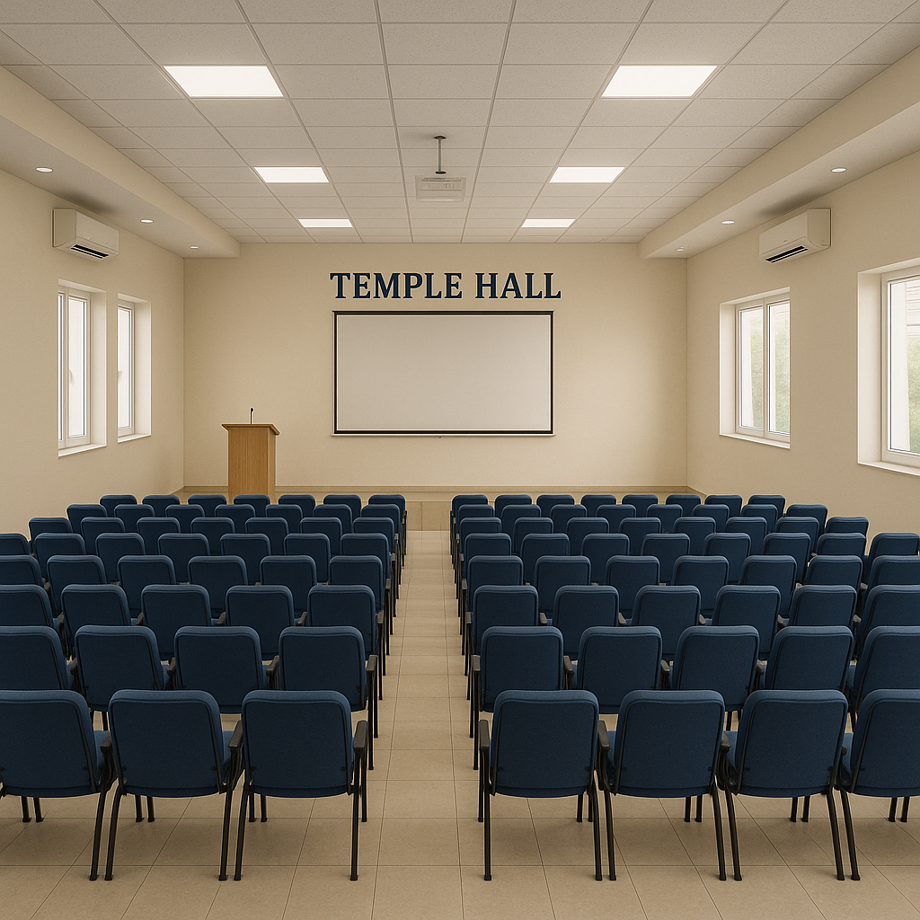 Designed with functionality and comfort in mind, Temple Hall features theatre-style seating, a raised stage with podium, a projection system, and ample natural lighting from large windows. Its clean, minimalist interior promotes focus and clarity, making it an ideal environment for learning and engagement. Temple Hall stands as a vital gathering space for both students and faculty, supporting the college’s commitment to academic excellence and community.